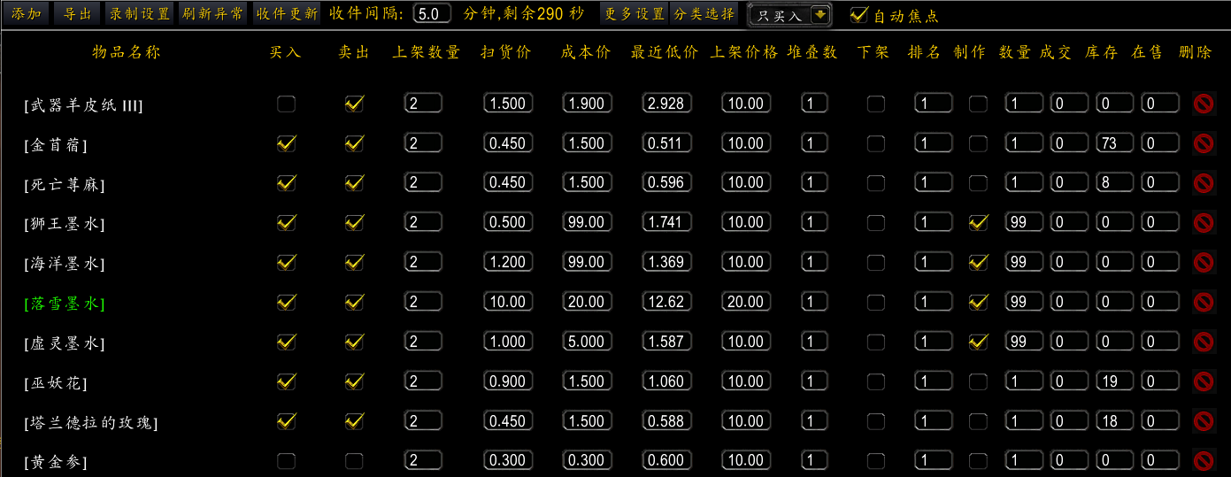 - 扫货价:如果需要扫货,填写最高买入价,买入不高于此价格物品