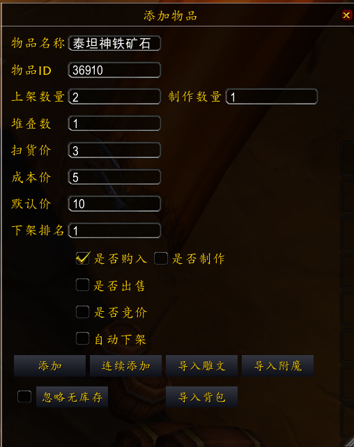 鼠标点击背包中的物品,移动到添加窗口上,会自动填写,物品名称与物品ID,如果没有正确填写 插件会异常。