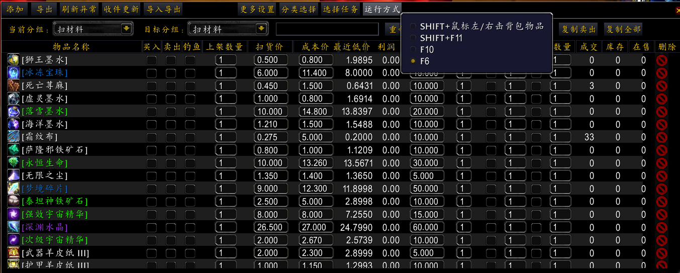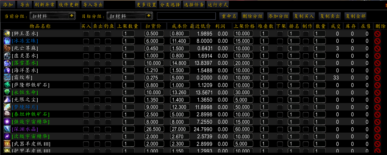 - 同步成本:全局扫描后,点击按钮,根据设置的材料分组信息, 更新 例如 雕文,FM卷轴的制作成本。并显示在 成本价